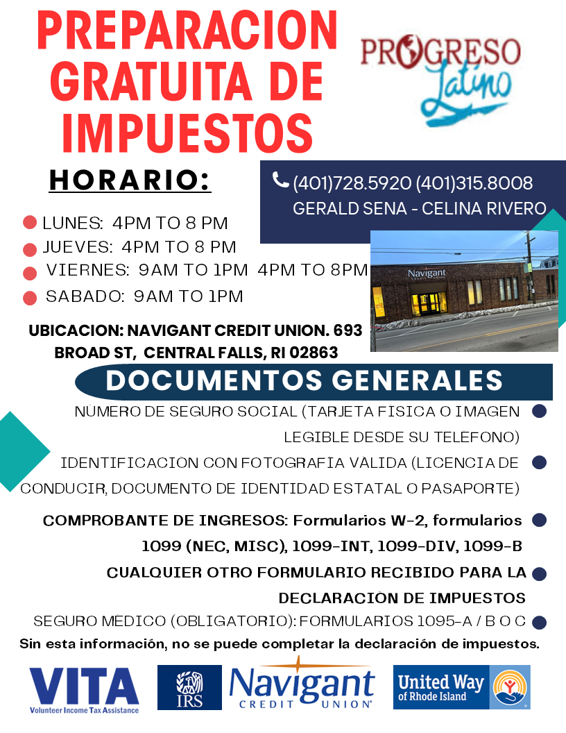 VITA (VOLUNTEER INCOME TAX ASSISTANCE) For More Information, Contact:(401) 728-5920 Ext.118voice (401) 315-8008 - (401) 347-9309crivero@progresolatino.org Additional Information Verify Nonprofit